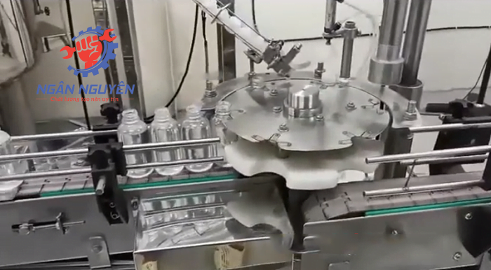 • Khi các công đoạn trước đó được hoàn thành như thổi chai, làm sạch chai. Chai sẽ được chuyển bằng băng tải đến bánh hình sao. Sau đó được giữ và xoay ngược lên bằng bộ phận kẹp chai.